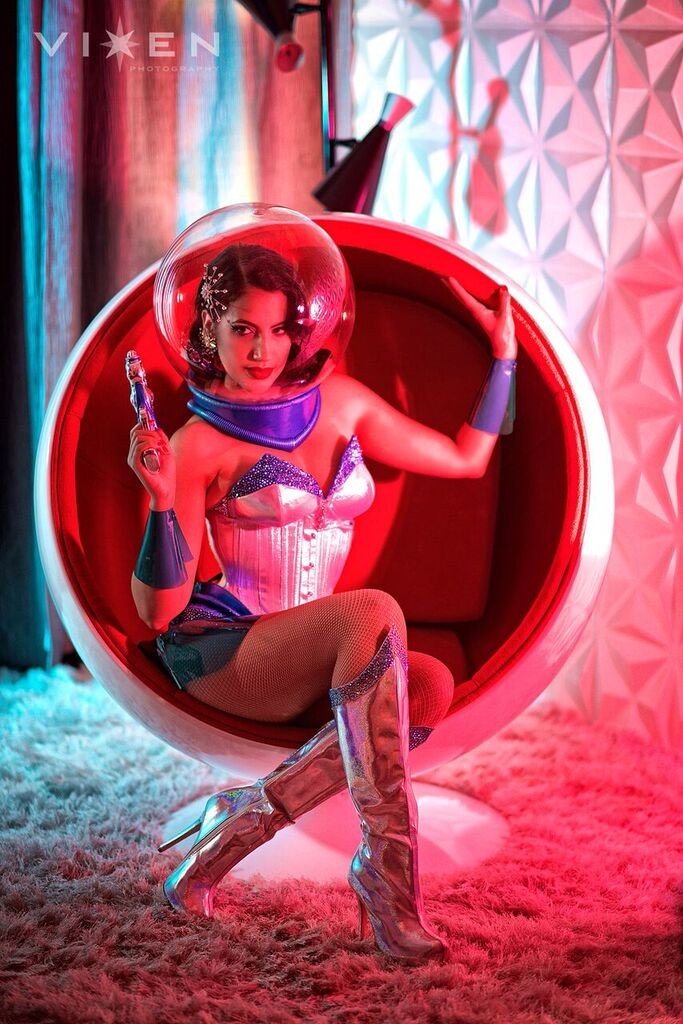 In this out of this world performance Lila pays homage to the 1950's and 1960s Retro Space Age. Complete with a ray gun, bubble helmet and custom space inspired costuming this kitschy number is sure to be a dazzling fun act.